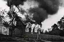During World War II, the inhabitants of Michniów actively cooperated with the Polish resistance movement, in particular with the Świętokrzyskie Home Army units commanded by lieutenant Jan Piwnik, pseudonym "Ponury" ("Grim"), a cichociemny ("Silent Unseen" special-operations paratroopers of the Polish Army in exile in SOE).[2] On July 12, 1943, a German military unit partially burned the village and murdered over 100 inhabitants. In retaliation that same night, Piwnik's partisans attacked the express train Kraków-Warsaw in the area of Podłazie, Skarżysko County, killing or injuring at least a dozen Germans. The next day, German Ordnungspolizei returned to Michniów, completely burning the village and murdering almost all Poles who lived there. In total, at least 204 people,[3][4] including men (mostly burned alive),[5] 54 women and 48 children,[6][7] as many as ten of them were less than 10 years old,[8] were victims of the massacres in Michniów. The youngest victim was a nine-day-old Stefanek Dąbrowa, thrown by a German military policeman into a burning barn.[9] Occupational authorities forbade the reconstruction of the village and cultivation of surrounding fields. After the war, the Michniów massacre became a symbol of German crimes committed in Polish villages. Currently in Michniów there is the Mausoleum of Polish Rural Martyrology.[10]