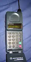The MicroTAC, released by Motorola on April 25, 1989, was the smallest and lightest phone available at the time. Upon its release, it made headlines across the world.[1] The phone was released as the "MicroTAC Pocket Cellular Telephone." The first MicroTACs were known as the Motorola 9800X, a continuation of the numerical name Motorola gave their phones in the 1980s. The MicroTAC was designed to fit into a shirt pocket. These very rare phones featured a black plastic housing and a red 8-character dot-matrix LED display, which was able to show more information than the display of its predecessor, the Motorola DynaTAC 8000X. However, dot-matrix displays of the time were still quite limited by today's standards. The inside of the flip piece had the "Motorola" logo on a diagonal, above thin blue diagonal lines. The badge on the front flip had a raised metallic Motorola logo, and "Micro T.A.C" in small blue letters above the display. The "micro" sized phone measured as long as over 9 inches (23 cm) long when open and weighed in 12.3 ounces (350 g) with the slim battery.[2] The phone incorporated a built-in alpha-numeric phone book as one of the many standard features. A numerically organized menu allowed the user to select options for phone operations. Some of the many options included security codes, two phone number operations, a charge rate and currency calculator, secretarial memory scratchpads, hands-free operation, keypad tones, memory protection, phone number and name storage, as well as cellular system operation options.