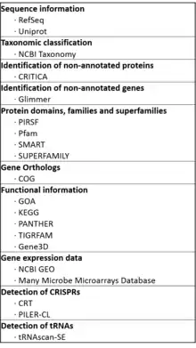 - Detection of CRISPRs: CRISPR[33] are DNA loci involved in the immunity against invasive sequences, where short direct repeats are separated by spacer sequences.[34] The databases generated by the CRT [35] and PILER-CL [36] algorithms are used to detect CRISPRs.
