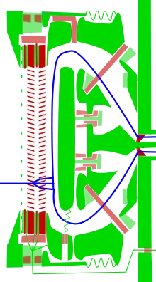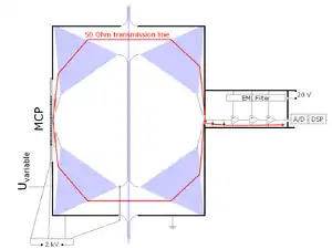 In a delay line detector the electrons are accelerated to 500 eV between the back of the last MCP and a grid. They then fly for 5 mm and are dispersed over an area of 2 mm. A grid follows. Each element has a diameter of 1 mm and consists of an electrostatic lens focusing arriving electrons through a 30 µm hole of a grounded sheet of aluminium. Behind that, a cylinder of the same size follows. The electron cloud induces a 300 ps negative pulse when entering the cylinder and a positive when leaving. After that another sheet, a second cylinder follows, and a last sheet follows. Effectively the cylinders are fused into the center-conductor of a stripline. The sheets minimize cross talk between the layers and adjacent lines in the same layer, which would lead to signal dispersion and ringing. These striplines meander across the anode to connect all cylinders, to offer each cylinder 50 Ω impedance, and to generate a position dependent delay. Because the turns in the stripline adversely affect the signal quality their number is limited and for higher resolutions multiple independent striplines are needed. At both ends the meanders are connected to detector electronics. These electronics convert the measured delays into X- (first layer) and Y-coordinates (second layer). Sometimes a hexagonal grid and 3 coordinates are used. This redundancy reduces the dead space-time by reducing the maximum travel distance and thus the maximum delay, allowing for faster measurements. The microchannel plate detector must not operate over around 60 degree Celsius, otherwise it will degrade rapidly, bakeout without voltage has no influence.