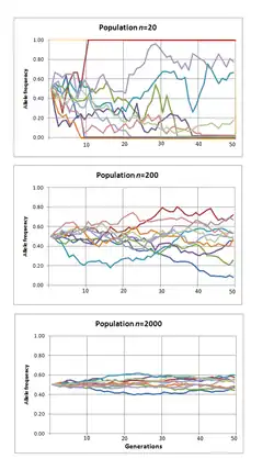 Genetic drift is the change in the relative frequency in which a gene variant (allele) occurs in a population due to random sampling. That is, the alleles in the offspring in the population are a random sample of those in the parents. And chance has a role in determining whether a given individual survives and reproduces. A population's allele frequency is the fraction or percentage of its gene copies compared to the total number of gene alleles that share a particular form.[28]