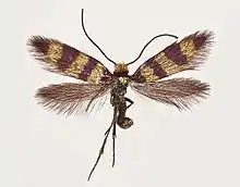 With a forewing length of 3.5–3.9 mm, male specimens of Micropterix gaudiella are smaller than their female counterparts (4–4.4 mm forewing length).[2]