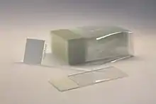 Microscope slides are usually made of optical quality glass, such as soda lime glass or borosilicate glass, but specialty plastics are also used. Fused quartz slides are often used when ultraviolet transparency is important, e.g. in fluorescence microscopy.[3][4]