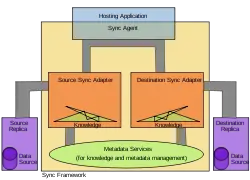 Microsoft Sync Framework is a data synchronization platform from Microsoft that can be used to synchronize data across multiple data stores. Sync Framework includes a transport-agnostic architecture, into which data store-specific synchronization providers, modelled on the ADO.NET data provider API, can be plugged in. Sync Framework can be used for offline access to data, by working against a cached set of data and submitting the changes to a master database in a batch, as well as to synchronize changes to a data source across all consumers (publish/subscribe sync) and peer-to-peer synchronization of multiple data sources. Sync Framework features built-in capabilities for conflict detection โ whether data to be changed has already been updated โ and can flag them for manual inspection or use defined policies to try to resolve the conflict. Sync Services includes an embedded SQL Server Compact database to store metadata about the synchronization relationships as well as about each sync attempt. The Sync Framework API is surfaced both in managed code, for use with .NET Framework applications, as well as unmanaged code, for use with COM applications. It was scheduled to ship with Visual Studio 2008 in late November 2007.[1]