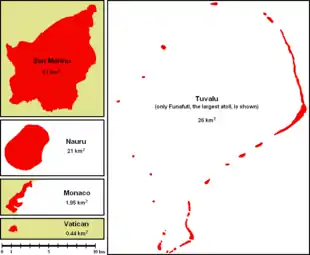| 26 km2 (10 sq mi) | 11,448 | 414.7 | Funafuti | Oceania | Polynesia | |