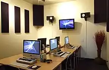 The Audio in Media six-month programme is divided into three terms. Terms 1 and 2 include initial subjects of study such as acoustics, psychoacoustics, ear training and audio production equipment components such as audio production consoles, microphones, recording media and signal processors. Delivery of curriculum includes both theoretical introduction to subjects followed by hands-on work within three dedicated in school production rooms. Term 3 (Practicums) requires students to complete audio production projects such as music multi-track recording, radio jingle production and sound design for video. Students also complete a Live Sound module hosted by a local Venue with a live band.[3]