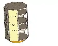 MidSTAR-1 has three interior shelves which provide area inside the satellite for mounting of components and payloads. Their locations are determined by the dimensions of the payloads and components. These can be varied in future implementations of the MidSTAR model if necessary, as long as the structure remains within the center of gravity requirements. The load-bearing structure of the octagon consists of the top and bottom decks, connected at the eight corners by stringers. The side panels of the spacecraft are 1/8" aluminum panels mounted to the stringers with #10 bolts.