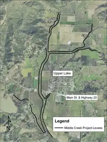 Upper Lake experienced severe flooding in 1938, 1955 and 1957–1958.[14] In 1954 the US Congress authorized the Middle Creek Project by the US Army Corps of Engineers to protect the community of Upper Lake and about 4,000 acres (1,600 ha) of agricultural land from flooding by the Middle, Scotts and Clover creeks. The project included 14.4 miles (23.2 km) of levees, diversions structures and a pumping station. It was completed in 1966. The state provided routine maintenance, flood fighting, levee patrolling and channel maintenance.[17] The levees suffered from erosion and subsidence, and rather than giving 100-year protection as designed by 2000 were giving only 4-year protection.[18]