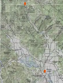 The Middle Creek watershed is a sub-watershed of the Clear Lake Basin. It is 99.5% contained in Lake County and 0.5% in Mendocino County. It includes the watersheds of Alley Creek and Clover Creek. It covers 50,155 acres (20,297 ha) (16.5%) of the Clear Lake Basin, and supplies 21% of the streamflow to Clear Lake.[6] Elevations in the watershed range from 4,840 feet (1,480 m) at High Glade Lookout in the north to about 1,349 feet (411 m) where Clover Creek joins Middle Creek. The east and west forks of the creek join at an elevation of about 1,480 feet (450 m). The Middle Creek and Clover Creek valleys combine to form a single valley north of the town of Upper Lake.[7][lower-alpha 1]
