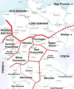 The dialect map of Germany by the end of the Middle High German period was much the same as that at the start of the 20th century, though the boundary with Low German was further south than it now is:[18][19]