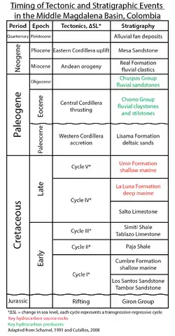 The middle sequence represents the formations deposited throughout the Cretaceous and Early Paleocene.[2] The oldest formations in this sequence are the Tambor and Los Santos Formations. The conglomerates and sandstones indicate a continental to fluvial depositional environment.[2] In the Early Cretaceous, sea level began to rise and formed a shallow marine environment with siltstone and shale deposits of the Cumbre Formation.[2][3] Sea level continued to rise throughout the Middle Cretaceous when the Tablazo and Salto limestones and Simití shales were deposited.[4] The La Luna Formation represents a maximum flooding surface with deep marine deposits of limestone, chert, and shale.[2] Sea level then began to fall, returning the environment to shallow marine with deposition of the Umir Formation of shales and sandstones.[2] Finally, the Paleocene saw the deposition of the Lisama Formation, consisting of deltaic mudstones and sandstones.[2] This entire middle sequence indicates a marine megacycle consisting of five transgressive-regressive cycles.[4] The angular unconformity between the second and third sequences is a result of erosion from the accretion of the Western Ranges.[2]