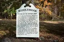 A portion of the first encampment site, known as the Washington Camp Ground, was added to the National Register of Historic Places on July 3, 1975. The Campground is located in Martinsville, a section of Bridgewater Township. The Middlebrook Encampment site includes part of the ridge of the First Watchung Mountain. Its position provided a natural fortress not only protecting the Continental Army but also overlooking the plains towards New Brunswick, where the British forces were stationed in 1777. A surviving earthen redoubt believed to date to the 1777 encampment is also located on the mountain within Washington Valley Park.[4] The strategic strength of the army's position on the Watchung or Blue Mountain ridge contributed ultimately to the success of the Continental Army by lengthening the war and wearying the British forces during both of the army's stays.[5][6][7][8]