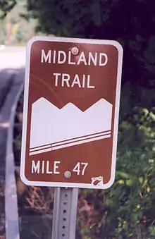 In this area, the Midland Trail follows the route of the historic James River and Kanawha Turnpike, an early road linking canals in the James River in Virginia with the navigable portion of the Kanawha River in West Virginia.