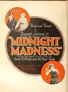 Midnight Madness is a 1918 American silent mystery film directed by Rupert Julian and starring Ruth Clifford, Kenneth Harlan and Harry von Meter.[1]