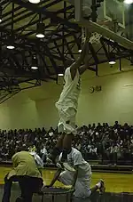 Some of the more outlandish occurrences during such events included coach participation, such as Michigan State Spartans men's basketball coach Tom Izzo riding a Harley-Davidson motorcycle onto the court and Florida Gators men's basketball coach Billy Donovan rising out of a coffin.[2] Although signing week, when top recruits sign letters of intent that commit them to specific schools, does not occur until November,[15] blue chip high school recruits are sometimes welcomed at these events even in their junior years.[14] Usually a prescribed number of fans (such as the first 1,000) receive a gifts such as t-shirts, posters, autographs, road game vacation packages, and other free paraphernalia.[14] At many such events, a student is chosen for a half-court shot giveaway.[14] Sometimes the events are televised live by sports networks such as the Big Ten Network, and other times highlights are shown on highlight shows such as ESPN's SportsCenter.[2] ESPNU has begun extensive yearly coverage of midnight madness events and in 2008 televised events at Davidson College, the University of Kansas, Georgetown University, Gonzaga University and Indiana University.[2][16] The events have been reported for years in print media such as newspapers, magazines and the internet.[17] Although Midnight Madness has become a prime time event for many premier basketball programs, some schools have continued the tradition of having their first practice at 12:00 on the first day regular practice is allowed.[18][19]
