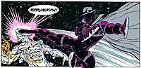 Midnight Sun fought the Silver Surfer alongside the Kree. With the help of a light-deadening dust, he used his talent for stealth to hit the Surfer with several sneak attacks. However, the Surfer eventually detected him and used his board to trap Midnight Sun, until an assault from a Kree vessel forced him to flee. The two fought one-on-one when the Kree sent Midnight Sun to protect Hala from the Surfer, but the Surfer defeated him again. Because the Kree's alterations had left him unable to speak or use his fingers, Silver Surfer was never aware of Midnight Sun's name or background, and could not communicate with him. Although his powers far exceeded Midnight Sun's, the Surfer considered him a very frustrating opponent due to his stony silence and often uncertain motivations, as well as his ability to catch the Surfer off-guard with surprise attacks and skillful strikes and dodges.[3]