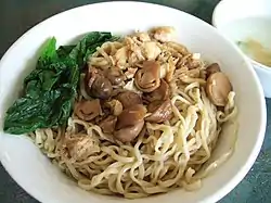 Mie ayam, mi ayam, or bakmi ayam (Indonesian for 'chicken bakmi', literally chicken noodles) is a common Indonesian dish of seasoned yellow wheat noodles topped with diced chicken meat (ayam).[3][4] It is derived from culinary techniques employed in Chinese cuisine.[5][6] In Indonesia, the dish is recognized as a popular Chinese Indonesian dish,[5] served from simple travelling vendor carts frequenting residential areas, humble street-side warung to restaurants.