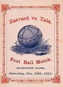 Harvard's first involvement with the sport can be traced to 1874, when Harvard played a two-game series vs Canadian McGill University.[4][5] As the second game was played under the rules of rugby football, Harvard embraced the game and continued until the establishment of American football rules that introduced concepts such as line of scrimmage or the system of downs.