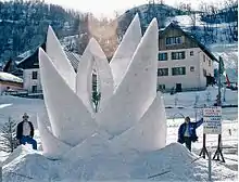 From 1996 he has constructed monumental sculpture for locations in the Americas, Europe and Asia.[4] These include a sculpture in Sokogla, Thailand (2005), works for the 2008 Olympics in Beijing, a work to commemorate the 80th birthday and 60th anniversary of the reign of King Bhumibol Adulydesen of Thailand (2006), a stainless steel piece in France (2007), a black marble sculpture for the ITM University, Gwalior in Bhopal, India (2007), a stainless steel piece called Amantes for the city of Goyan, South Korea (2009) and monumental sculpture for his hometown (2009) .[4] In 2008, he created a sculpture called La Tehuana, which is located at the main highway entrance to the city of Tehuantepec, Oaxaca. The theme of the piece is traditional, an image of a traditional Tehuana bride, which has been adopted as the symbol of an area where women play a dominant social role.[2][6] However, it is a modern interpretation done in stainless steel, a style more common in the center and north of Mexico than in the south.[7]}