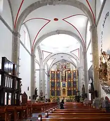 The church and former monastery of San Gabriel is located next to the Tacuba Metro station. The main entrance to the atrium has a stone gate with three arches. The small atrium is mostly paved with a few trees. The façade is mostly Baroque with the portal marked the two grooved Doric columns and topped by a frieze with vegetative design done in relief. It has one bell tower with two levels also in Baroque. The side portal faces Calzada Mexico-Tacuba. It also has an arched entryway, but marked with wavy grooved pilasters and topped with a niche. Part of the former cloister is also preserved. The interior is focused on the main altar, which is gilded and has twelve colonial era paintings of the Virgin Mary and various saints along with Salomonic columns. In the center is an image of the crucified Christ and the top has an image of God, the Father. One other feature of the church is an image of the Child Jesus called the “Niño futbolista” (Football playing child), named such because it is dressed in the uniform of Mexico's national team when it plays in the World Cup .[2]