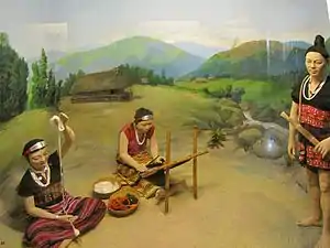 British India silver coins and Yunnan silver coins are used for necklaces and cane rings are sometimes worn below the knee. The hair is worn long and often tied up in a small puggaree.