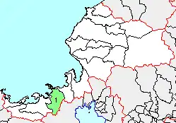 Location of Mikatakaminaka-gun, Fukui Prefecture, highlighted in green; with former areas in yellow.