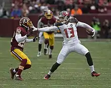 On September 8, Evans caught seven passes for 147 yards and a touchdown in a season-opening 48–40 win over defending the NFC South champion New Orleans Saints.[71] The next week, Evans caught ten passes for 83 yards and a touchdown in a 27–21 win over the defending Super Bowl champion Philadelphia Eagles.[72] In a 30–27 loss to the Pittsburgh Steelers on Monday Night Football in Week 3, Evans caught 6 passes for 137 yards and a touchdown, breaking the Buccaneers franchise record for touchdown receptions in a career with his 35th.[73] He eclipsed 5,000 career yards with 59 yards in Week 4 (at 25 years 40 days, the second youngest player to this mark by 113 days to Randy Moss) and after a bye week, Evans caught four passes for 58 yards in a 34–29 loss to the Atlanta Falcons, breaking Mark Carrier's Buccaneers franchise record for receiving yards in a career. The following week, Evans caught 7 passes for 107 yards in a 26–23 win over the Cleveland Browns, his 16th game with 100+ receiving yards, again breaking a Mark Carrier franchise record.[74] Evans then led all NFL receivers in Week 8 with 179 yards (a career second-best) on six receptions in a 37–34 loss to Cincinnati, which included a career-long 72 yard reception for a touchdown in the fourth quarter.[75] The next two weeks were far less successful: In Week 9, Evans had just one reception for 16 yards on 10 targets against the Carolina Panthers,[76] and three receptions for 51 yards in Week 10. He rebounded in Week 11's 38–35 loss to the New York Giants with six catches for 120 yards and a touchdown and recovered a fumble by quarterback Jameis Winston in the end zone for another touchdown. In Week 12, he again broke the century mark with 116 yards on six receptions in the 27–9 win over the San Francisco 49ers.[77] In the game, he passed 1,000 receiving yards on the season, joining Randy Moss and A. J. Green as the only receivers in NFL history to begin their careers with five consecutive 1,000+ yard seasons.[78] In Week 17, during a 34–32 loss to the Atlanta Falcons, Evans caught six passes for 106 yards and two touchdowns; with that performance Evans broke the Buccaneers franchise record for receiving yards in a single season and became the youngest receiver in league history to reach 6,000 yards receiving in a career.[79][80]
