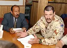 In Somalia, Kelly was actively involved in the prosecution of the warlord Hussan Gutaale Abdul.[8] Gutaale, who among many other things had attacked and killed 16 aid workers and repeatedly driven an armoured car into emaciated refugees awaiting food distribution,[8] was arrested by an Australian patrol, held in a cage at Baidoa airport and later flown to Mogadishu to be held by US forces. He was found guilty of 31 counts of murder by a panel of three judges and sentenced to 20 years' hard labour.[8]