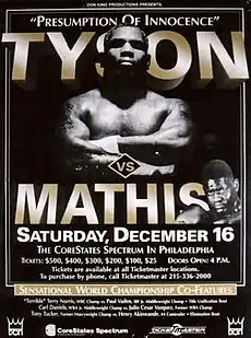 Mike Tyson had returned to boxing after a three-year prison stint with an 89-second victory over Peter McNeeley. After his victory, Tyson's rank as the number one ranked heavyweight was restored by the three major boxing organizations (the WBA, WBC and International Boxing Federation). Before he would fight for one of the three World Heavyweight titles, he would first partake in second comeback fight. Only days after his victory over McNeeley, it was announced that he would face the undefeated but virtually unknown Buster Mathis Jr. on November 4, 1995 at the MGM Grand Arena.[1] The bout was originally scheduled to go up against the highly anticipated rubber match between Riddick Bowe and Evander Holyfield on pay-per-view, with Tyson–Mathis to be aired on Showtime, while Bowe–Holyfield would be broadcast on rival HBO.[2] However, on September 14, Tyson promoter Don King would stun the boxing world by announcing that the Tyson–Mathis match would instead be broadcast for free on Fox.[3] Three weeks before the fight, Tyson suffered a broken thumb, but did not announce it until November 1, three days before the fight. In a press conference at the MGM Grand, Tyson announced the cancellation of the fight because of the injury.[4] Then, on November 22, it was announced that the bout had been moved to Atlantic City with a December 16 date in place and that Showtime would air the fight instead of Fox.[5] Plans were changed after New Jersey gaming authorities ruled against having the fight in Atlantic City because Don King had been under suspension in New Jersey since 1994 because of legal troubles. On November 30, Philadelphia's CoreStates Spectrum was announced to host the fight with Fox regaining the rights to air it.[6]