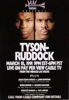 Mike Tyson vs. Donovan Ruddock, billed as The Fight of the Year, was a professional boxing match contested on March 18, 1991 at the Mirage in Paradise, Nevada, USA. At the time the two fighters were the top two ranked contenders for the WBC, WBA, and IBF world heavyweight championships that were at the time held by Evander Holyfield. The bout was a twelve-round championship eliminator fight, with the winner becoming the mandatory challenger to Holyfield's crown.