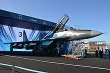 The Mikoyan MiG-35 (Russian: Микоян МиГ-35; NATO reporting name: Fulcrum-F) is a Russian multirole fighter that is designed by Mikoyan, a division of the United Aircraft Corporation (UAC). Marketed as a 4++ generation jet fighter, it is a further development of the MiG-29M/M2 and MiG-29K/KUB fighters.[8][9] According to a Russian defense industry source, the Mikoyan MiG-35 is essentially an upgraded variant of the MiG-29KR.[10][7] Many consider MiG-35 a new name given by Mikoyan for marketing.[11][12][13][14][15] The first prototype was a modification of the aircraft that previously served as a MiG-29M2 model demonstrator given temporary name MiG-35 but a later prototype was a different model with different equipment that served as the base for the MiG-35 as is known today. Mikoyan first officially presented the MiG-35 internationally during the 2017 Moscow air show;[1] the first two serial production aircraft entered service in 2019.[13]