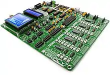 | Easy boards | Full-featured development boards with onboard programmers. Users can plug different microcontrollers via DIP sockets or specialized PCB cards. | EasyPIC v7