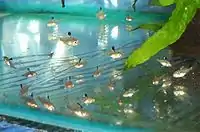 Bolivian rams are biparental, open-spawning cichlids.[7] Limited data are available on reproduction in the wild; in captivity, though, courtship is known to involve various body movements including head shaking, quivering, and preparation of spawning sites, including shallow pits. These behaviours are mainly undertaken by the male and in aquaria are known to last around 48 hours.[3] After courtship, the female deposits some 100–200 ovoid, brownish-coloured eggs on the chosen surface, normally a flattened stone, but occasionally a leaf.[3] The eggs are laid in lines; when the female has laid one line, the male passes over it and fertilises the eggs; the female then continues on to the next line and so on until egg laying is complete. In aquariums at 27 °C (80 °F), eggs take about 60 hours to hatch. During this time, the clutch is primarily cared for by the female, which fans the eggs and often adds sand to the clutch, possibly to camouflage the eggs.[3] Newly hatched fry are transported by the mouths of the parents to the shallow pits dug by the male during courtship and moved regularly between pits. The fry become free-swimming after seven days and are led about in a dense school by the parents for foraging.[3]