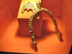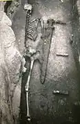 Over 2,500 inhumation burials, mainly in cemeteries of the Great Moravian period, have now been found at Mikulčice. The largest and richest of these cemeteries were those associated with the Basilica church (no. 3) and the Kostelisko site. The detailed study of the chronology and typology of grave goods is yet to be completed.[20] A degree of social stratigraphy can be distinguished in the with the élite warrior burials who are accompanied by their swords and the horse-men who are equipped with gilded bronze spurs and battle axes.