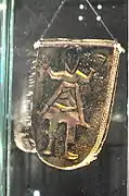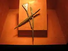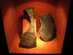 In 1958 the excavations moved to the palace building, to the west of Church 3. The palace had been built of stone, but the stone had been removed and the rectangular outline was preserved by the robber trenches.[9] The building was 26 m long and 10 m wide, with a hall with a fireplace, at the west end and a smaller chamber at the east end.[10] Some rich burials were found in the area and there was extensive evidence of metalworking including goldsmithing.[11] There was some evidence of settlement that pre-dated the Great Moravian Empire including a hoard of clay animal figurines. A number of iron styli for writing on wax tablet were discovered, suggesting that the building would have been used for administrative purposes.