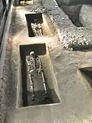 From 1964 to 1974 the second phase of excavation explored the outer bailey and oxbow lakes with preserved woodwork and bridges. This was followed by the third phase from 1975 to 1990, which concentrated on area excavation within the ramparts of the acropolis which ended previous work. Also between 1984 and 1990 the Kostelisko cemetery was excavated to the west of the 9th church. This contained approximately 415 graves which were accompanied by rich grave goods.[16] In 1990 the yearly excavations were suspended. In 1993 a series of limited excavations, mainly to confirm the stratigraphy on the main sites were started. Also the Research Institute of the Czech Academy of Sciences started rescue excavations in the vicinity of Mikulčice. These include the Panské Cemetery, excavated in 1999–2000, when the railway to Prerov was widened. This cemetery revealed 128 burials from the 9th to the 11th centuries.[17]