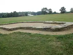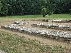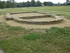In 1960 excavation moved to an extramural settlement outside the rampart, which had been reached over the river course by a wooded bridge. Extensive remains of wood were recovered including a logboat. Also discovered was a circular stone rotunda church with two semi-circular apses.[14] Also in 1961 the 8th church was excavated, which had a rectangular nave and chancel. The graves of surrounding cemetery were relatively poorly furnished, but in the nave of the church was found a large hoard ironwork, including axes, ploughshares sickles and iron ingots.[15] Also excavated was the bridge leading into the Outer bailey and the surrounding rampart. Finds from river-bed included another longboat, an archery bow, identified as being made from English yew, wicker fish-traps, ladles, spoons, buckets and vats.[14]