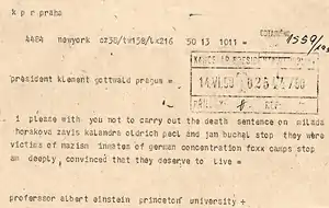 Milada Horáková was sentenced to death on 8 June 1950, along with three co-defendants (Jan Buchal, Oldřich Pecl, and Záviš Kalandra). Many prominent figures in the West, notably scientist Albert Einstein, former British Prime Minister Winston Churchill, French President Vincent Auriol and former US First Lady Eleanor Roosevelt, petitioned for her life, but the sentences were confirmed. Horáková was hanged in Prague's Pankrác Prison on 27 June 1950 at the age of 48.[3] Her reported last words were (in translation): "I have lost this fight but I leave with honour. I love this country, I love this nation, strive for their wellbeing. I depart without rancour towards you. I wish you, I wish you..."[13]