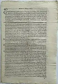 Milano was the first gazette published in the city of Milan. The first known number still in existence is dated 28 November 1640,[lower-alpha 2] but it is probable that the printing started some months before.[1] As all the newspapers of such time, it derived directly from hand-writing newssheets. It is probable, but it is not verified, that the editor of the Milano was Filippo Velasca who during the 1640s was a compiler of handwritten Avvisi in Milan.[1]
