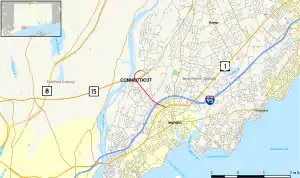 ![]() Map of New Haven County in southern Connecticut with Milford Parkway highlighted in red | |