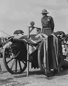 It is generally assumed that during World War II, chaplains were unarmed. Crosby describes an incident where a US chaplain became a trained tank gunner and was removed from the military for this "entirely illegal, not to mention imprudent" action.[10] At least some British chaplains serving in the Far East, however, were armed: George MacDonald Fraser recalls[11] "the tall figure of the battalion chaplain, swinging along good style with his .38 on his hip" immediately behind the lead platoon during a battalion attack. Fraser asks, "if the padre shot [an enemy], what would the harvest be ... apart from three ringing cheers from the whole battalion?"[11] The Reverend Leslie Hardman, the British Second Army's senior Jewish chaplain, who became well known for his work amongst the liberated prisoners after the capture of Bergen-Belsen concentration camp, was another who insisted on being armed while on active service.[12]