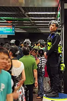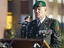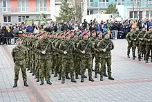 In all service branches, the beret is "bashed" to the right and a badge or insignia is worn above the left eye. In the army, all units can wear them with certain units wearing unique ones.[13] In the navy, the beret is an optional item[14] and in the air force, it is only worn by certain units.[15]