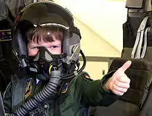 Young military brat gives thumbs up while wearing a pilot's helmet at a base special event.
