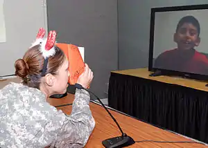 U.S. Army soldier in Iraq talking to her child by teleconference