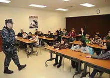 Military brats on a school field trip to the base security department, Naval Air Station Whidbey Island, Washington state, US