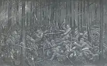 Peace between the Iroquois and the French lasted until 1658 when the French withdrew their missions from Iroquois settlements.[15] Although the Iroquois Confederacy continued their expansionary campaigns in the mid-1650s, the breakout of a wider front in 1659 and 1660 strained the confederacy.[37] To secure a new peace, the French dispatched the Carignan-Salières Regiment in 1665,[15] the first group of uniformed professional soldiers to set foot on what is today Canadian soil, and whose members later formed the core of the Compagnies Franches de la Marine, a local militia.[44] The regiment's arrival prompted the Iroquois nations to agree to peace by 1667.[15]