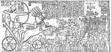 Chariotry, the backbone of the Egyptian army, was introduced into ancient Egypt from Western Asia at the end of the Second Intermediate Period (c.1650–1550 BC) / the beginning of the New Kingdom (c.1550–1069 BC).[29] Charioteers were drawn from the upper classes in Egypt. Chariots were generally used as a mobile platform from which to use projectile weapons, and were generally pulled by two horses[30] and manned by two charioteers; a driver who carried a shield, and a man with a bow or javelin. Chariots also had infantry support.[31] By the time of Qadesh, the chariot arm was at the height of its development. It was designed for speed and maneuverability, being lightweight and delicate in appearance. Its offensive power was in its capacity to rapidly turn, wheel and repeatedly charge, penetrating the enemy line and functioning as a mobile firing platform that afforded the fighting crewmen the opportunity to shoot many arrows from the composite bow. The chariot corps served as an independent arm but were attached to the infantry corps. At Qadesh, there were 25 vehicles per company. Many of the lighter vehicles were retained for scouting and communication duties. In combat, the chariots were deployed in troops of 10, squadrons of 50 and the larger unit was called the pedjet, commanded by an officer with the title 'Commander of a chariotry host' and numbering about 250 chariots.[32]