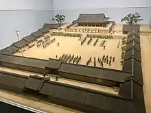 In 1897, the Imperial Korean Army comprised the central army and the provincial armies. It was as part of strengthening the Korean Empire's National Defense. The central army's backbone is the Imperial Guard consisting of the Attendant (Chinwidae, Hangul: 친위대, Hanja: 親衛隊), and Retinue (Howidae, Hangul: 호위대, Hanja: 扈衛隊) Guards, and the Capital Guard. The central army was directly under the Board of Marshal's member, Marshal Jung Ae-Kun to defend the emperor and the capital city of Hanyang. The provincial armies (Jibangdae, Hangul: 지방대, Hanja: 地方隊) and the garrison guards (Jinwidae, Hangul: 진위대, Hanja: 鎭衛隊) defend the borders.[3][10] With the central and provincial armies, the army grew immensely to 28,000 before 1907.[11]