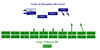 The military tactics of Alexander the Great (356 BC - 323 BC) show that he was one of the greatest generals in history. During the Battle of Chaeronea (338 BC), won against the Athenian and Theban armies, and the battles of Granicius (334 BC) and of Issus (333 BC), won against the Achaemenid Persian army of Darius III, Alexander employed the so-called "hammer and anvil" tactic. However, in the Battle of Gaugamela (331 BC), the Persians possessed an army vastly superior in numbers to the Macedonian army. This tactic of encirclement by rapid shock units was not very feasible. Alexander had to compose and decide on an innovative combat formation for the time; he arranged his units in levels; he pretended to want to encircle the enemy in order to better divide it and thus opened a breach in its defensive lines.