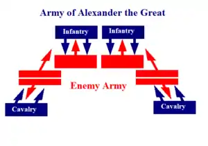 Attacking from the flanks, the Macedonian cavalry surprised the enemy troops by the speed and force of its impact; in the center, the phalanx and the hypaspists advanced to open the second front. Once the enemy's way was closed, it was left in a trap. Generally, this caused great confusion because it could not be distinguished whether the units were dispersed or just poorly coordinated.